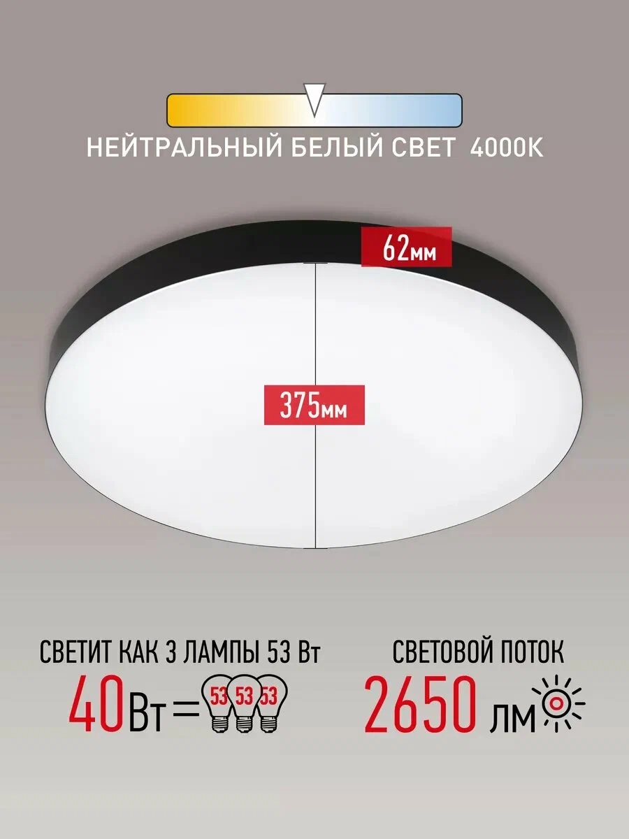 Светильник потолочный, обечпечивает яркое и равномерное освещение площадью до 18 кв.м., светой яркий (световой поток 2650 лм), нейтральный белый свет 4000к, диаметр 375 мм. Вариант энергоэффективный, надёжный.