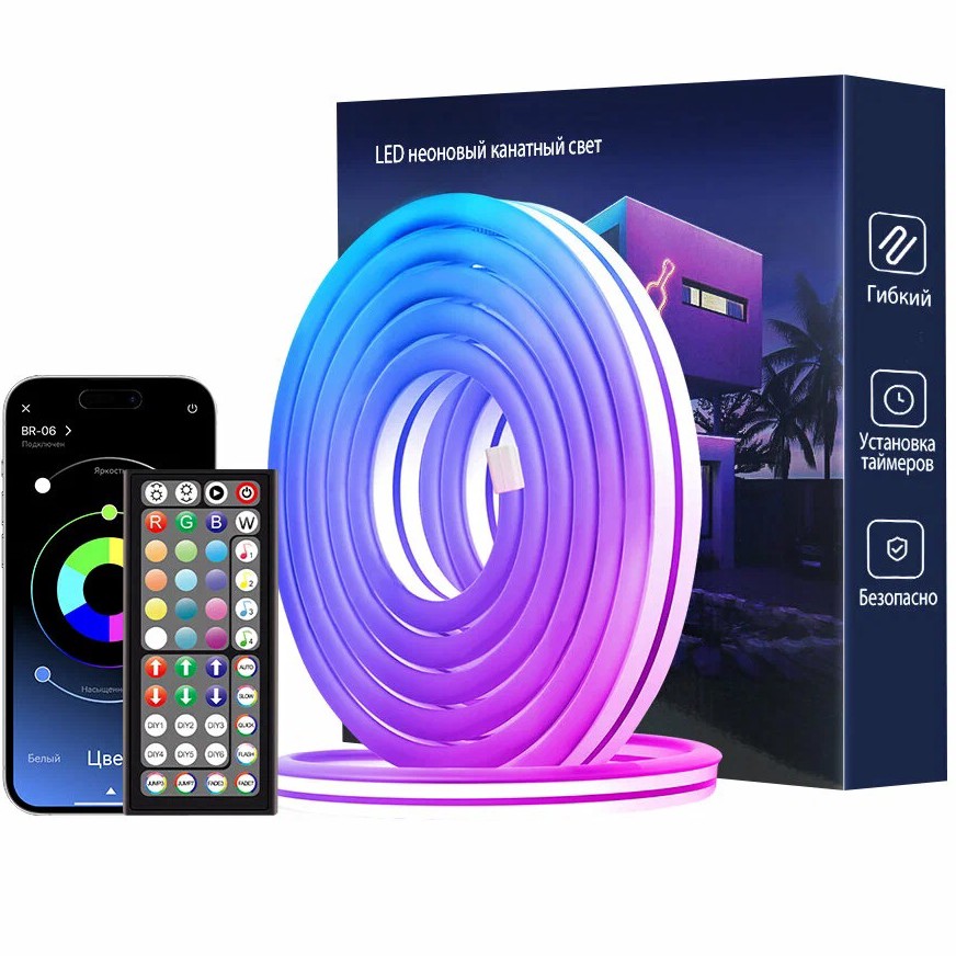 Степень защиты IP67 и силиконовый кожух. Можно вешать и на фасад, и в ванной, и на улице. Лента реагирует на звук - можно устроить световое шоу под музыку дома или в саду. Управление разное: пульт, голос, телефон, даже акустический датчик. Подключается к умному дому. Светит плотно, без чёрных точек между диодами.