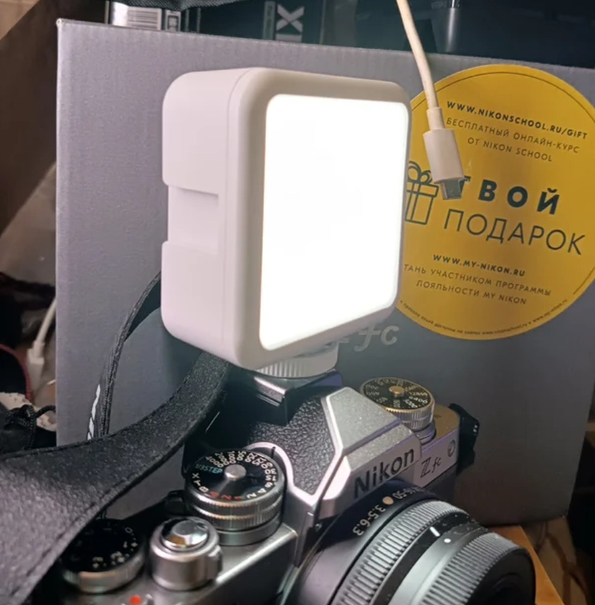 Удобная штука для съёмок: регулируется яркость, встроенный аккумулятор на 2000 мАч рассчитан на работу от 2.5 до 15 часов в зависимости от режима, заряжается через Type-C. Крепится на камеру или штатив.