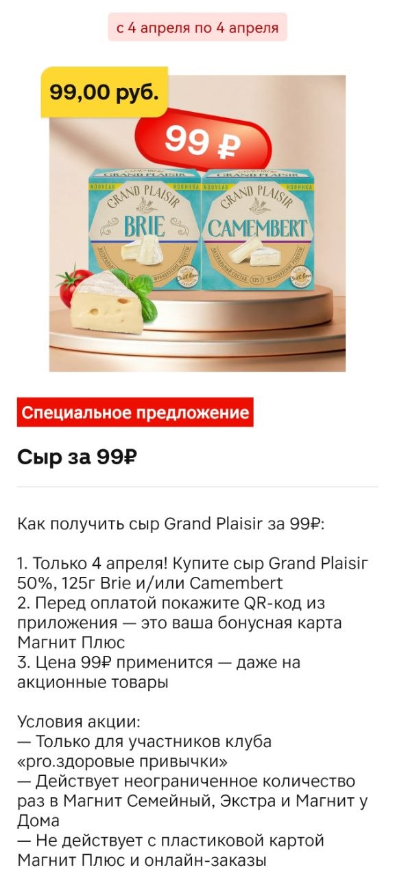 В приложении Магнит есть клуб "pro.здоровые привычки" и там сегодня сыр Grand Plaisir 50% 125 г Brie и/или Camembert за 99 рублей. Скидка действует на кассе по QR-коду карты Магнит Плюс неограниченное количество раз 4 апреля.