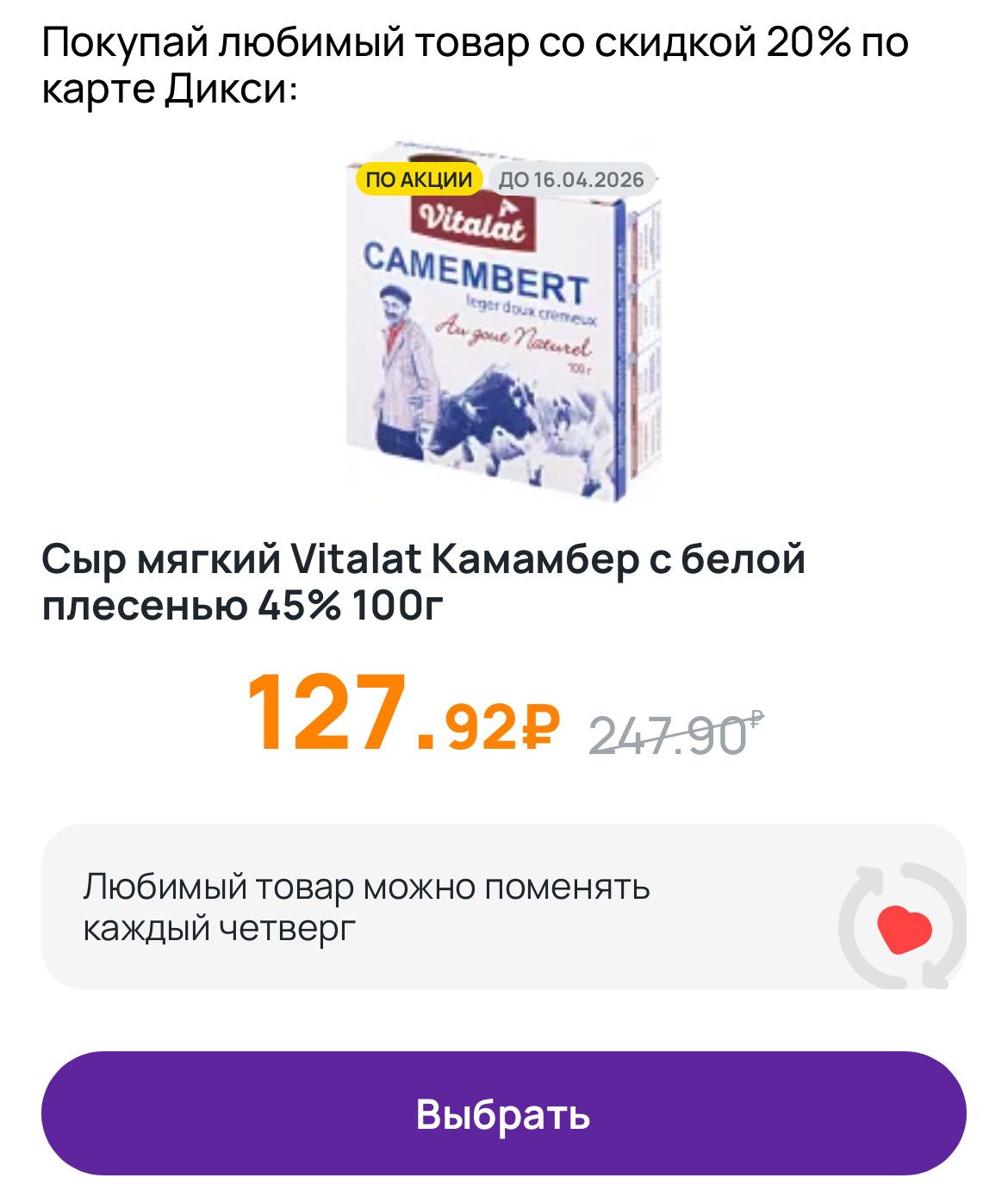 Нужно выбрать сыр любимым продуктом и будет доп.скидка 20%. Но и без этого цена выгодная!