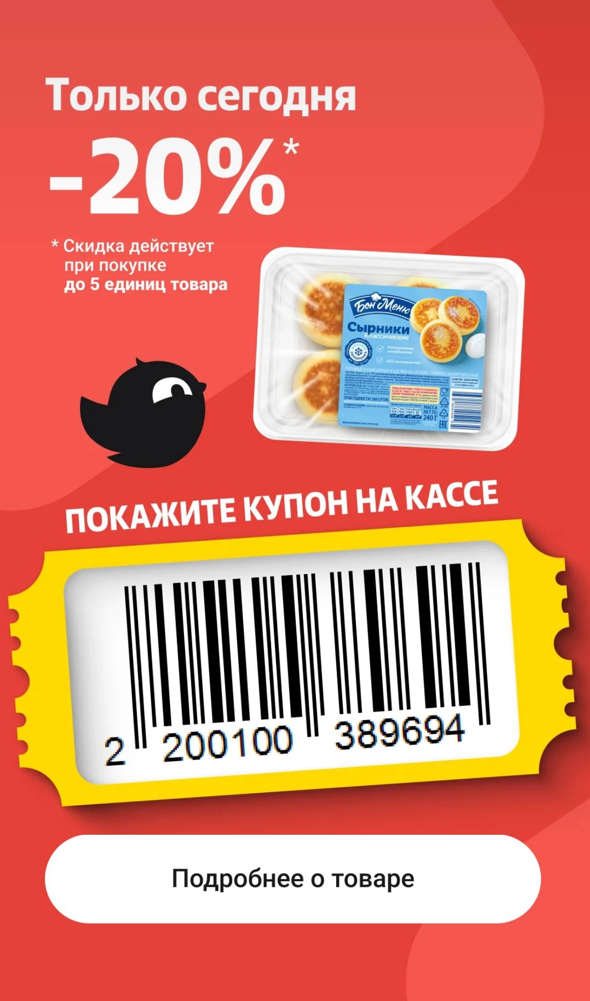 Только сегодня можно купить сырники с выгодой 20%. До 5 штук на 1 чек. Нужно показать купон на кассе до оплаты.