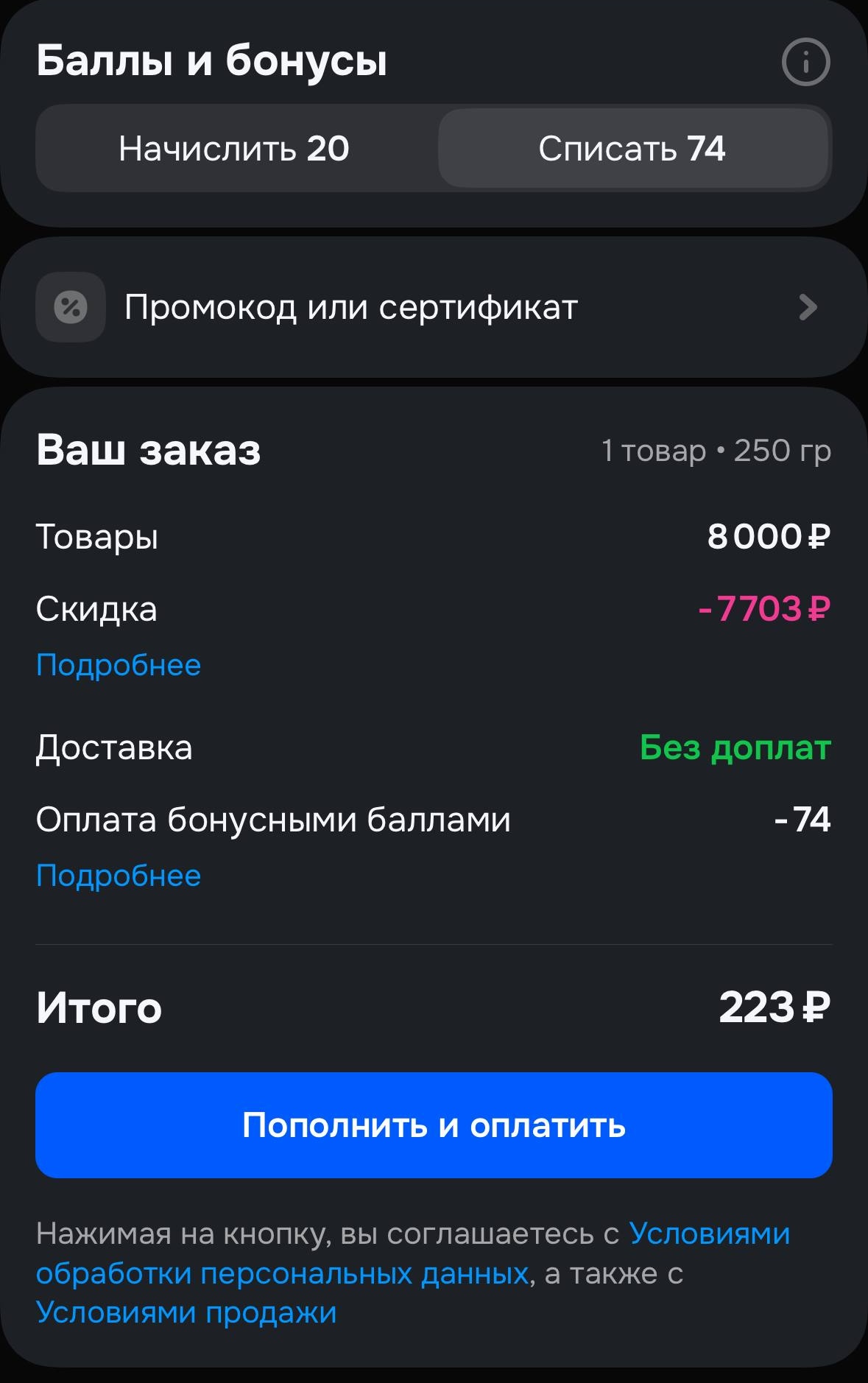 Нужно взять 100 бонусов продавца вот тут. И списать их при оформлении заказа. Получается всего 223р - классная цена!