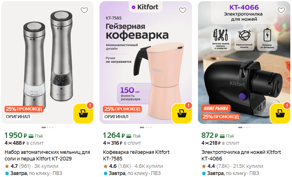 На Яндекс Маркете сейчас цены на Kitfort ниже, чем на других площадках. А по промокоду KITFORT25 - ещё минус 25%. Смотрите, что можно взять: