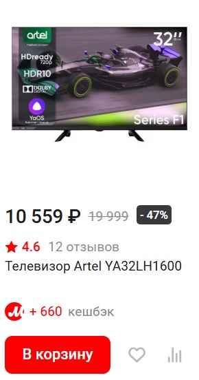 Умный телевизор для кухни или комнаты по цене смартфона! Телевизор Artel YA32LH1600 сейчас всего за 8 438 ₽ на Яндекс Маркет у продавца М.Видео.