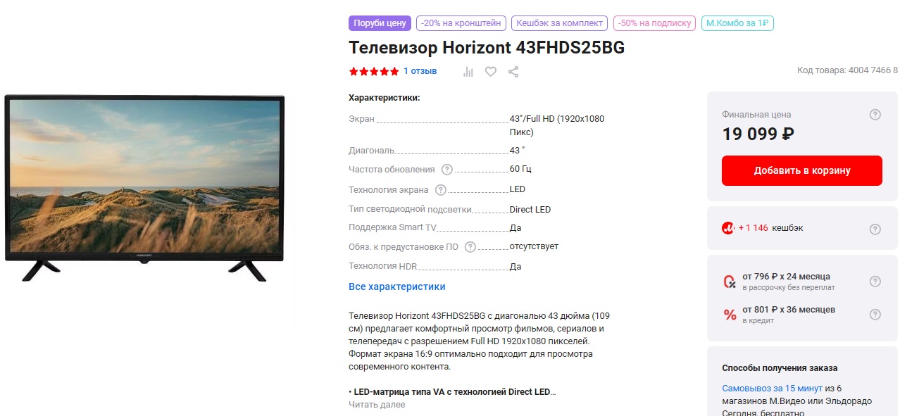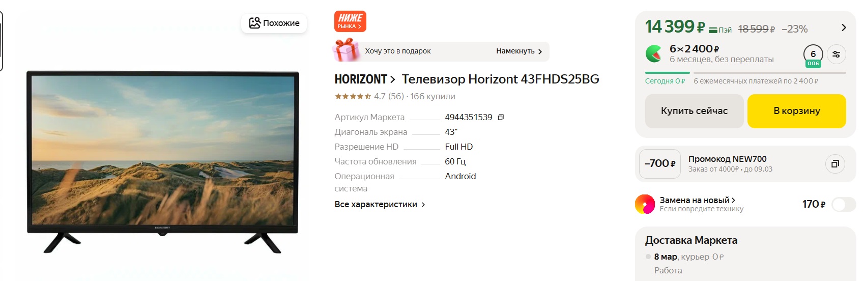 У меня цена 14399. Продавец мвидео. 43" с Full HD, HDR10, голосовое управление Google. Работает на Android TV, есть разные разъемы.
