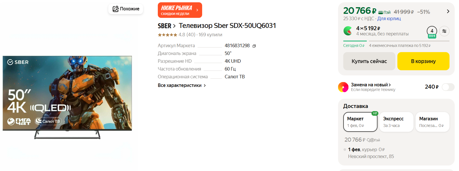 В среднем везде такой 30000₽. 50-дюймовый 4K UHD телевизор на VA-матрице, ОС «Салют ТВ», управлять которой можно и голосом, а интерфейс интуитивно понятен.
