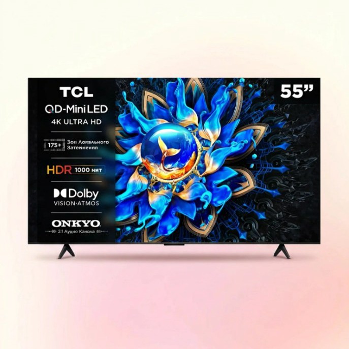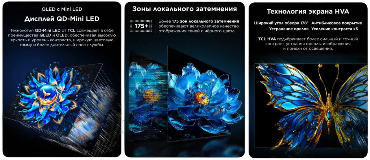 4K разрешение, mini-LED подсветка и QLED экран. Поддерживает HDR, Dolby Vision и IMAX. Работает на Google TV, по звуку заявлено 40 Вт.