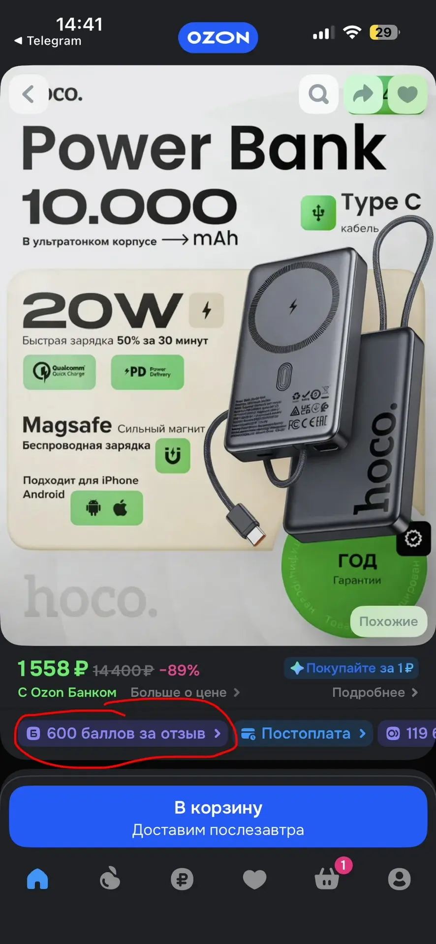 А ещё нашёл внешний аккумулятор Hoco Q44 10000 мАч, 20 Вт за 1558р + за отзыв тоже получишь 600 баллов