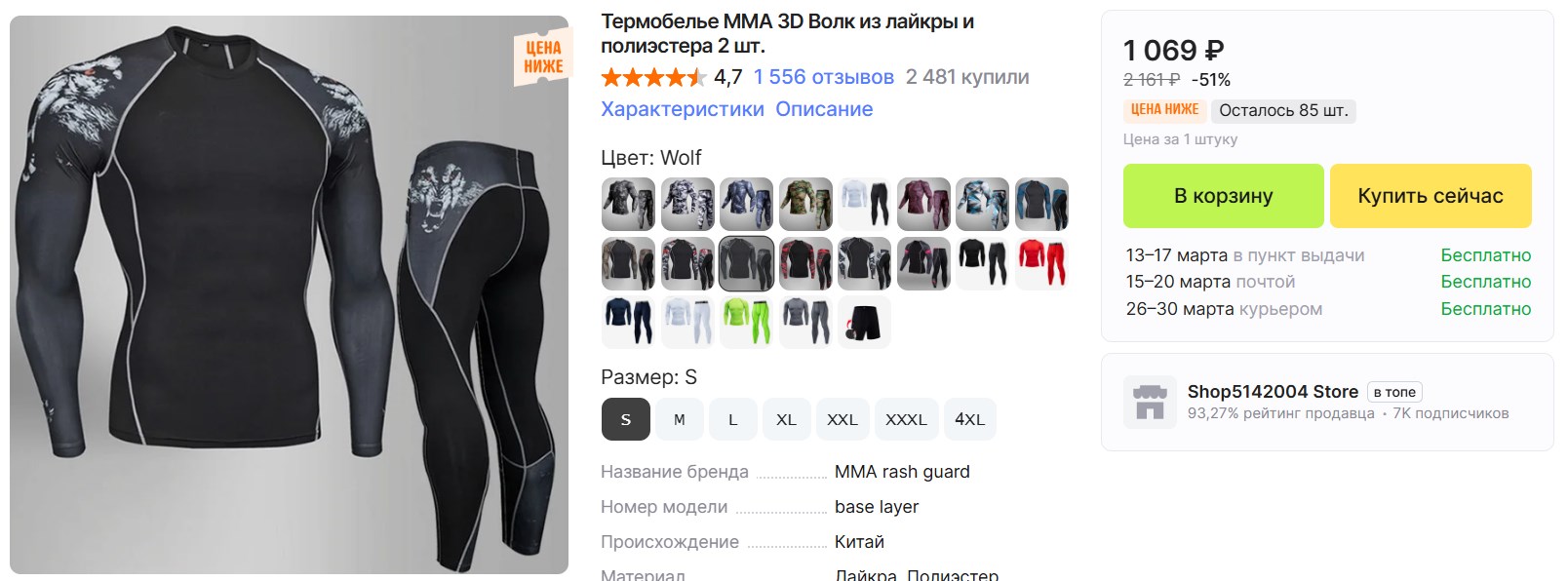 Привет. На Али сейчас термобельё MMA 3D Волк за 1069₽. Много заказов и отзывы нормальные. Комплект: верх и низ. Ткань дышащая, тянется в четырёх направлениях, быстро сохнет и отводит влагу. Подойдёт для зала, бега, ММА или просто активного отдыха. Размеры от S до XXXXL.