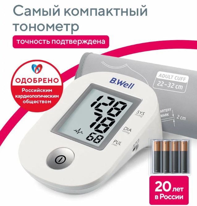 Автоматический, с манжетой 22–32 см. Точный, показывает аритмию. Работает от батареек.