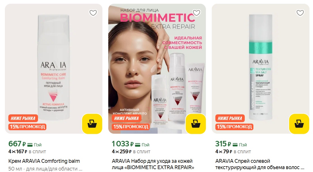 На каталог с товарами бренда ARAVIA действует 15% скидка по промокоду за подписку на магазин. Ассортимент товаров большой, есть зубные пасты, косметические наборы, средства для ухода за волосами, лицом и телом.