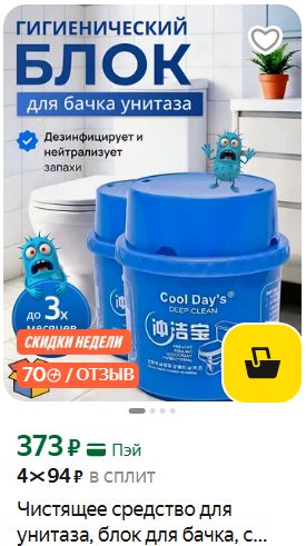 Чистящее для унитаза (2 шт.) - 373₽ + 70 баллов (итого ~151₽ за штуку).