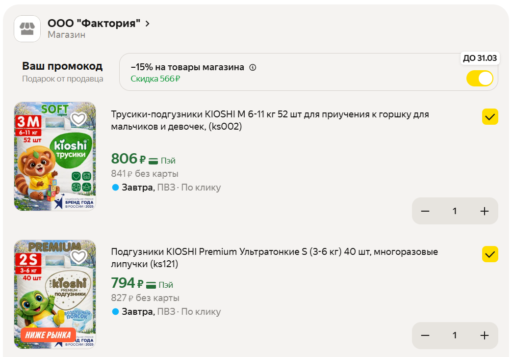 Подгузники и прокладки от японских брендов со скидкой 15% за подписку на магазин. Есть разные размеры и упаковки - от небольших пачек до объёмных. Можно взять на пробу или сразу запастись впрок.