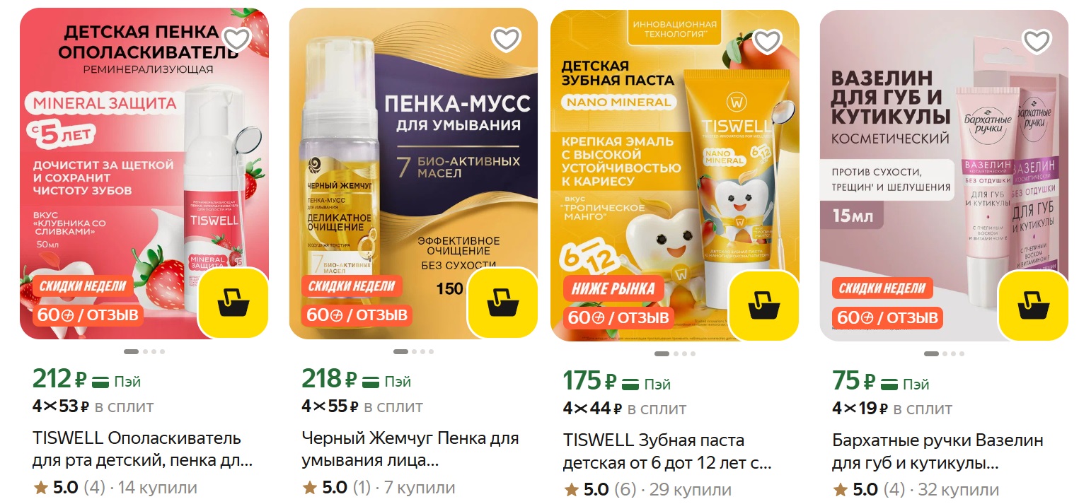 У продавца Бьютолоджи появились по 60 баллов за отзыв на различные товары. Можно выгодно закупится средствами для гигиены рта, для умывания лица и душа.