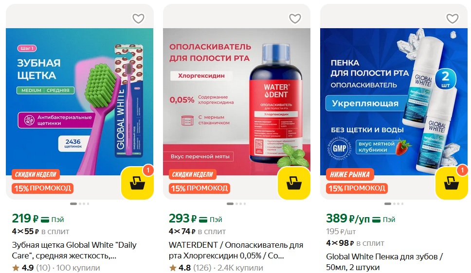На Яндекс Маркет доп. скидка 15% на товары Global White и Waterdent, цены получаются ниже чем где либо.