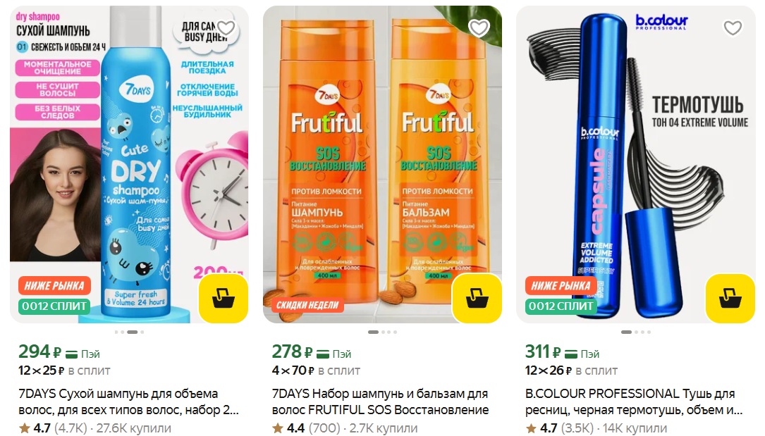 Низкие цены на уходовую косметику для волос, лица и тела 7DAYS.