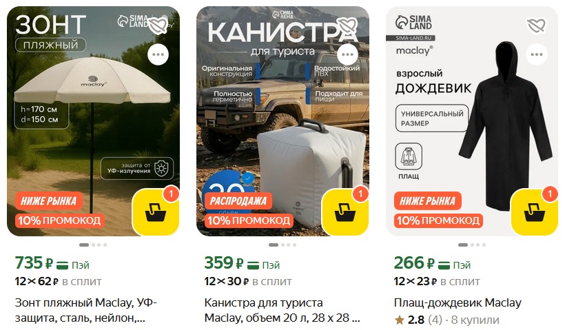 Недорогие и практичные товары для туризма, кемпинга и отдыха на природе maclay по сниженным ценам. В ассортименте есть всё необходимое: от пляжных зонтов до складных столовых приборов.