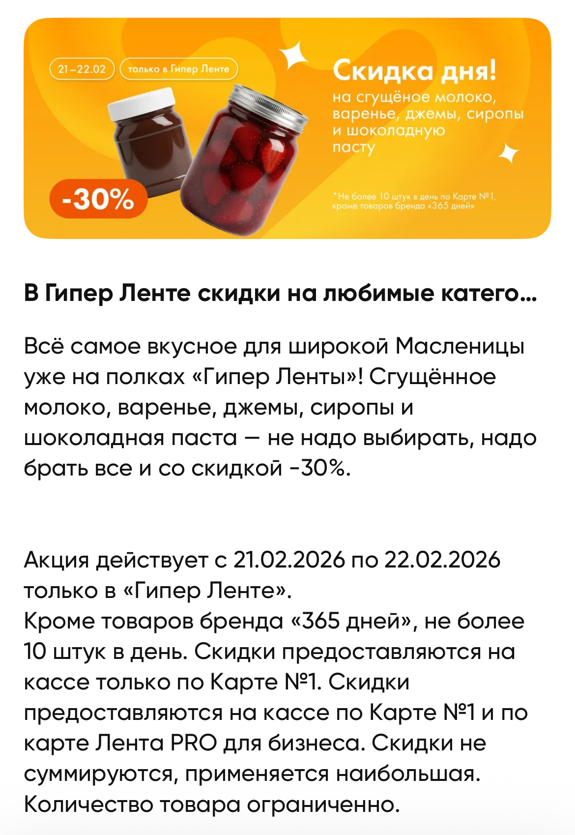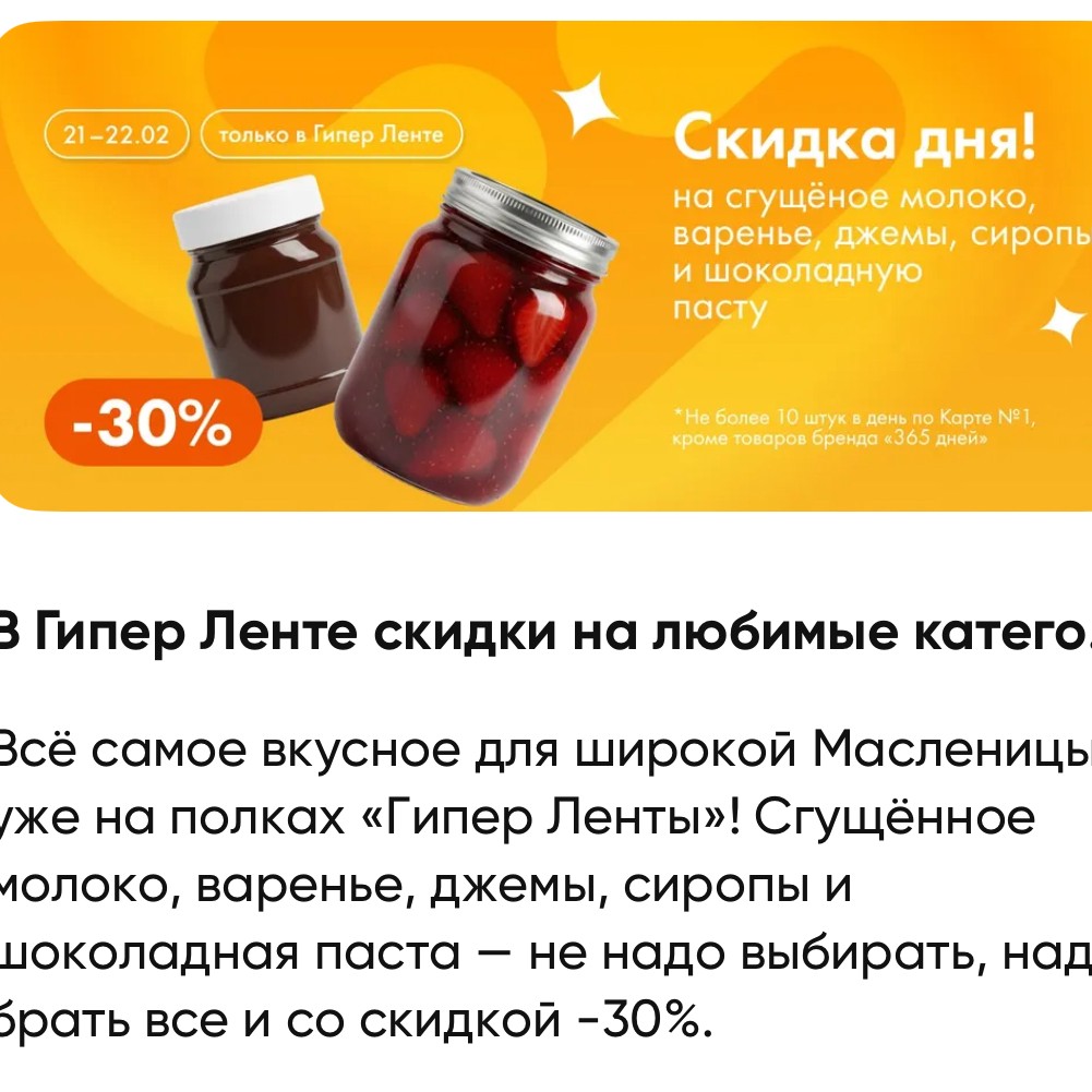 • - 30% на сгущёное молоко, варенье, джемы, сиропы и шоколадную пасту, но не более 10 штук по одной карте: