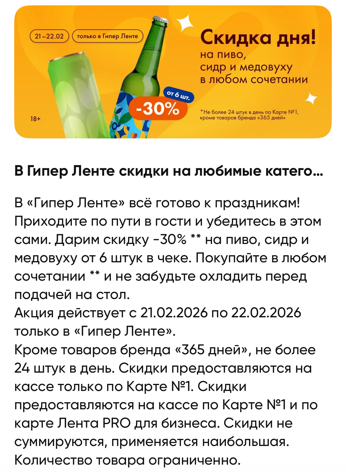 • - 30% на пиво, сидр и медовуху в любом сочетании, но не более 24 шт по одной карте: