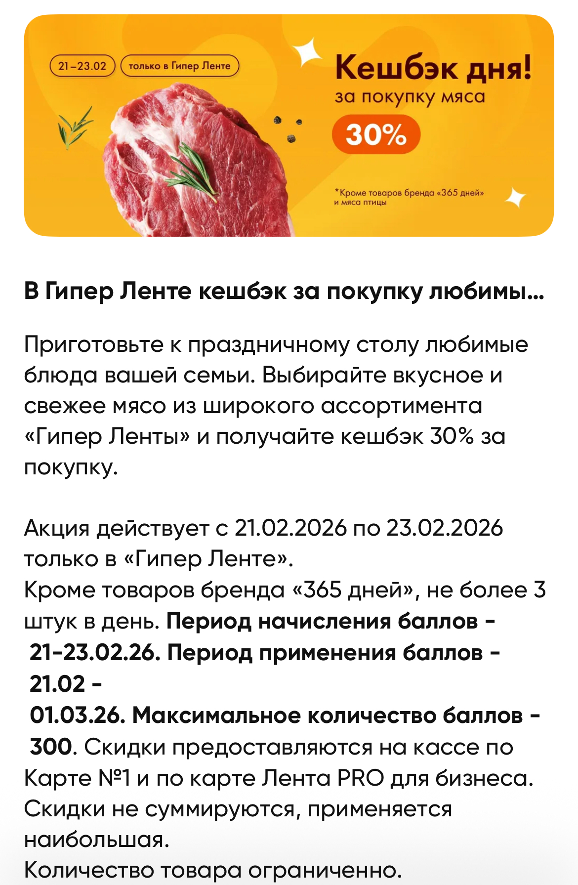 • Кеш 30% на покупку мяса, максимум 300: