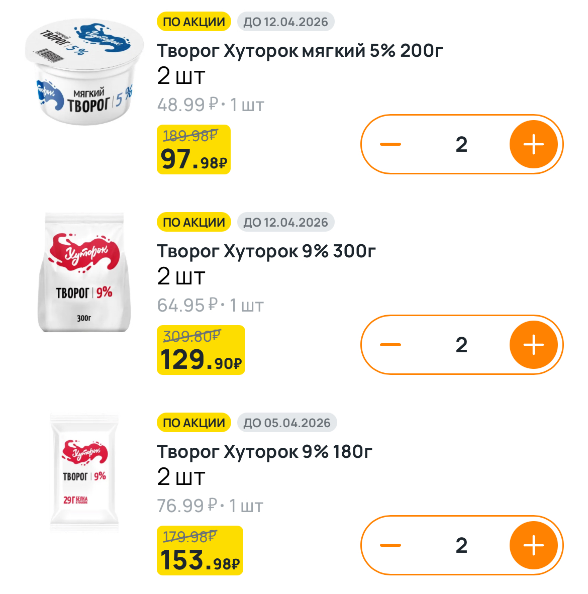 Акция до конца дня. Низкие цены на различный творог, нужно смотреть какой есть в наличии у вас. Цены меняются при добавлении в корзину от 2-х штук.