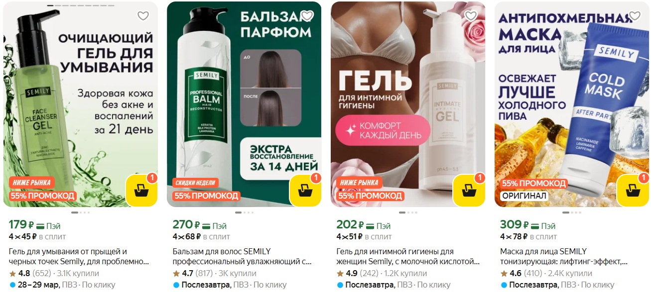Продавец на Яндекс Маркет дал огромную скидку 55% на 4 популярных уходовых средства бренда SEMILY. Цены получаются очень хорошие.