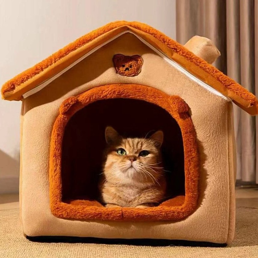 Она полузакрытая, из мягкого плюша, в который так приятно зарыться носом. Внутри ещё и подушка съёмная - можно стирать. Выглядит как норка, питомцу будет где уединиться и чувствовать себя защищённо.