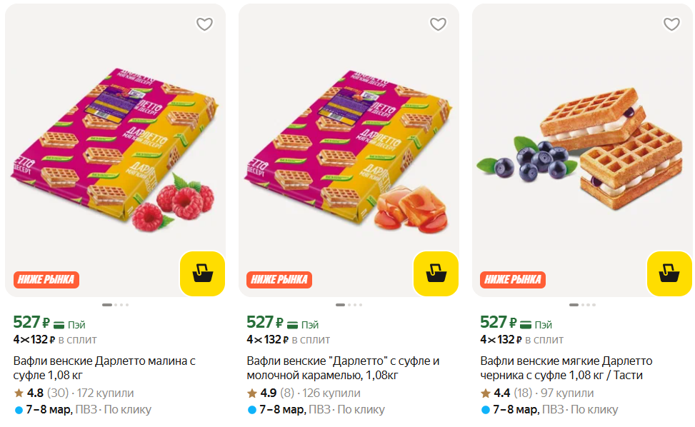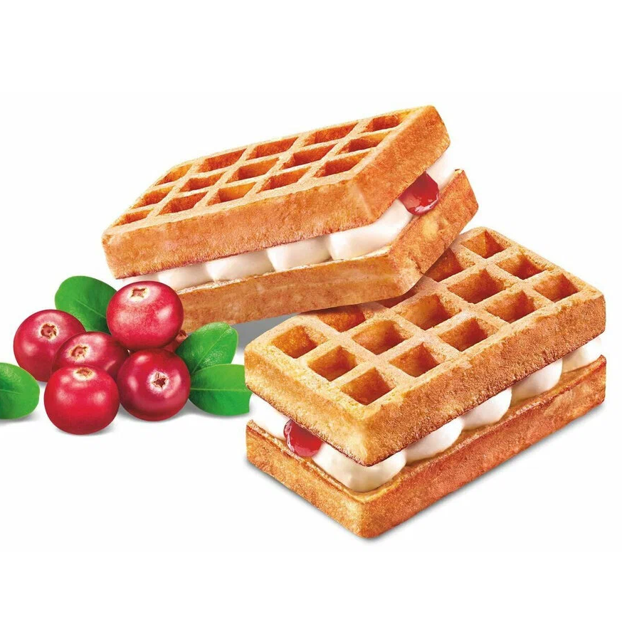 За килограмм хорошая цена. Мягкие вафли с суфле. Вкусов четыре: клюква, малина, молочная карамель, черника. За 527 рублей - хороший вариант для чаепития или взять с собой.