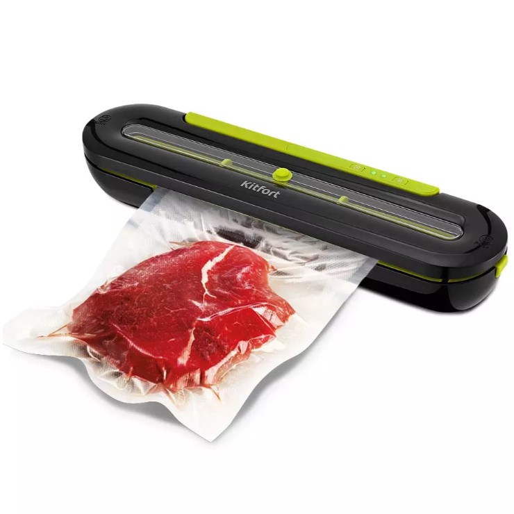 Мощность 100 Вт, производительность 6 л/мин. Работает с пакетами до 28 см в ширину, в комплекте уже есть 10 пакетов 15×20 см. Удобно для хранения мяса, рыбы, сыра и заготовок.