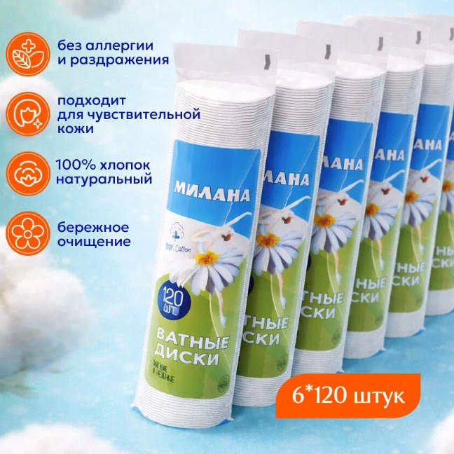 Девчат, кто любит хорошие ватные диски и покупает сразу много - смотрите, что нашла. «Милана», хлопок 100%, 6 упаковок по 120 штук (итого 720 дисков) всего за 410₽ на Маркете.