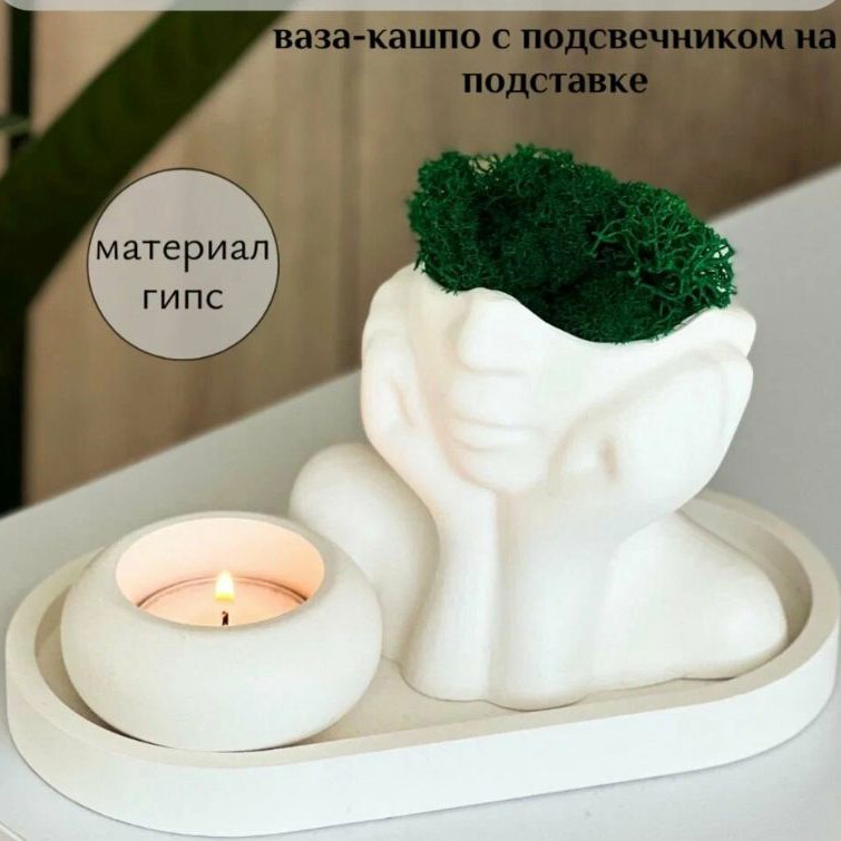 Это ваза-кашпо в виде женского лица, поднос и подсвечник. Всё из гипса, написано, что авторская работа. Можно найти ему множество применений: посадить небольшой цветочек, складывать украшения или каки-то мелочи на косметическом столике.