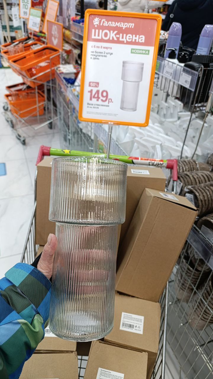 До 8 марта включительно в розничных магазинах Галамарт ваза стеклянная по ШОК-цене - 149₽ (скидка недоступна для заказа через интернет-магазин).