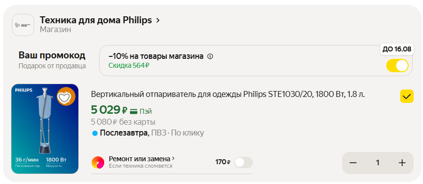 Когда выбирала вертикальный отпариватель, отсеяла всё, где мощность меньше 1800 Вт и подача пара ниже 30 г/мин. Остановилась на Philips STE1030 - у него 36 г/мин и бак на 1.8 л.
