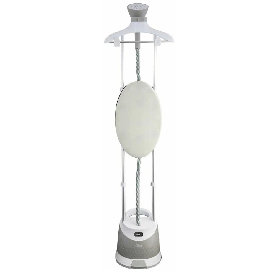 В комплекте: стойка до 123 см, вешалка с зажимами для брюк, съёмный столик, тефлоновая рукавица, насадки для воротников и щётка