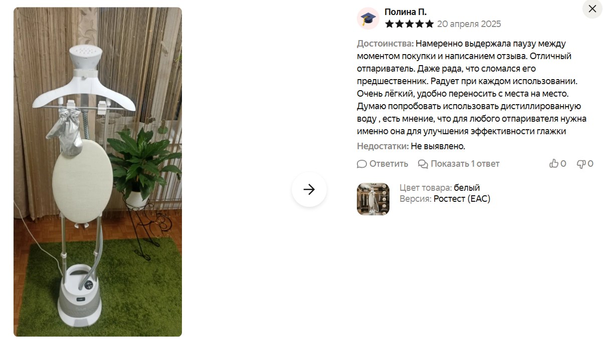 Отличная цена на отпариватель! 4629₽ на Яндекс Маркете - это существенно ниже, чем в других местах (где он от 6300₽). За эти деньги получаете полноценную напольную систему с телескопической стойкой, гладильным столиком и кучей аксессуаров .
