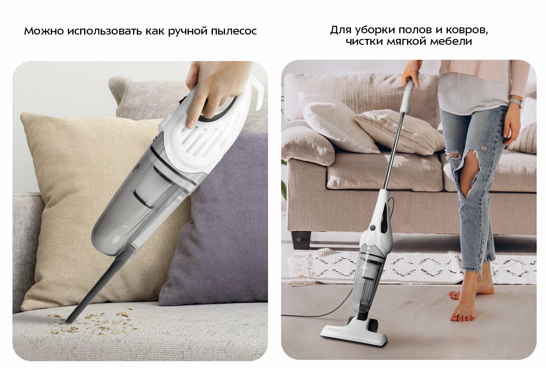 Лёгкий и манёвренный. Весит всего 1,7 кг, управляется одной рукой. Узкой насадкой чистим углы, плинтусы, решётки вентиляции и даже салон машины. Прозрачный отсек для пыли легко вытряхнуть и помыть.