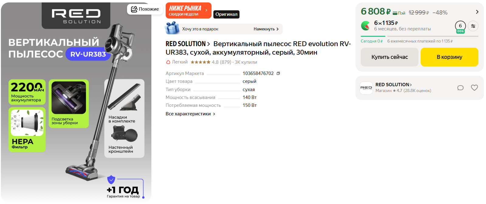 Цены на этот пылик в других магазинах от 8500 р и выше, а на Маркете он сейчас за 6808 р, если оплачивать картой Пэй. Беспроводной, вертикальный, места занимает немного.