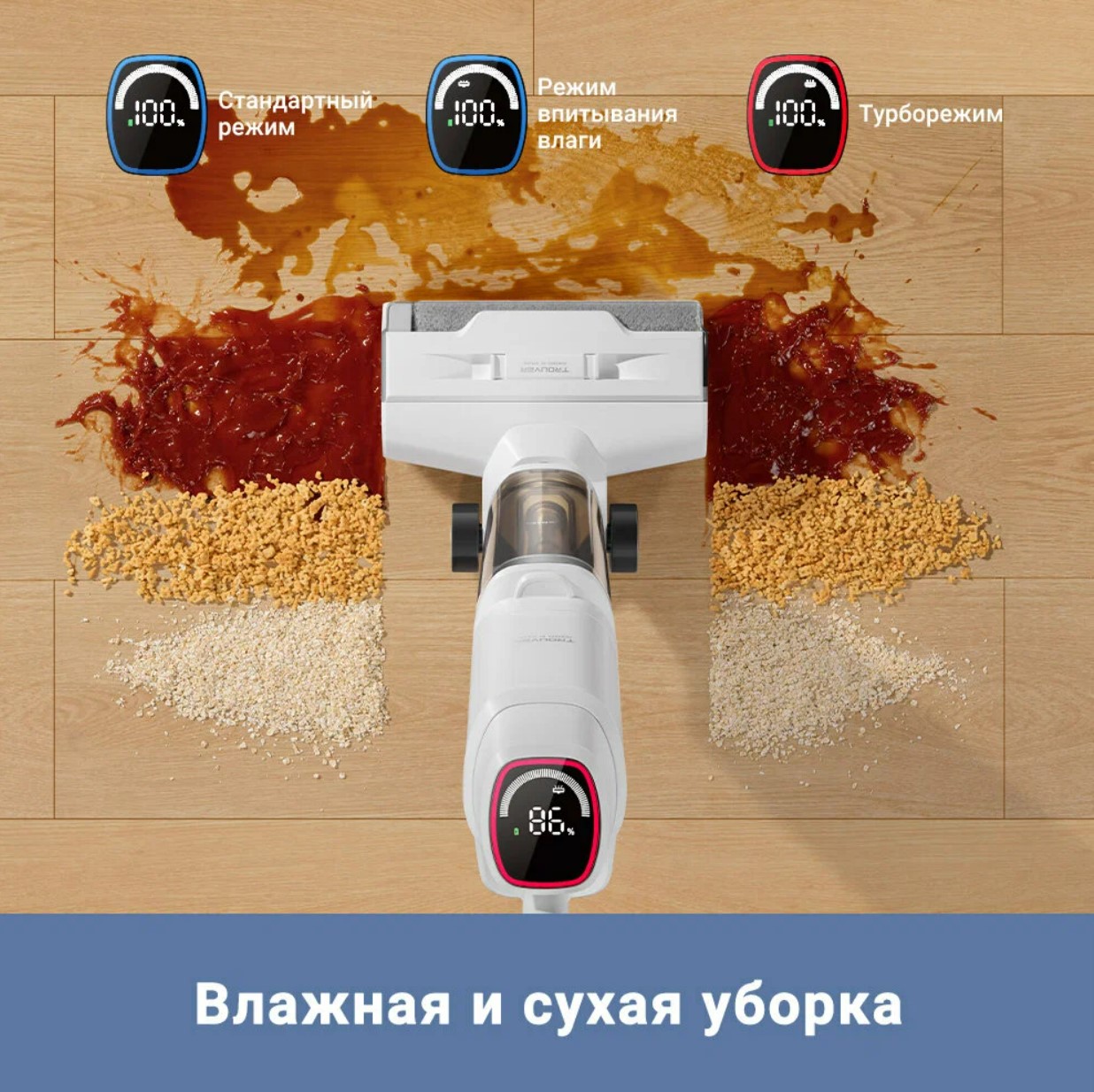 Моет полы. Залил в контейнер воду с каплей средства, прошёлся - пол чистый, и жидкость он же сам и собрал. Разлил чай - не бегу за тряпкой, хватаю его, очень выручает