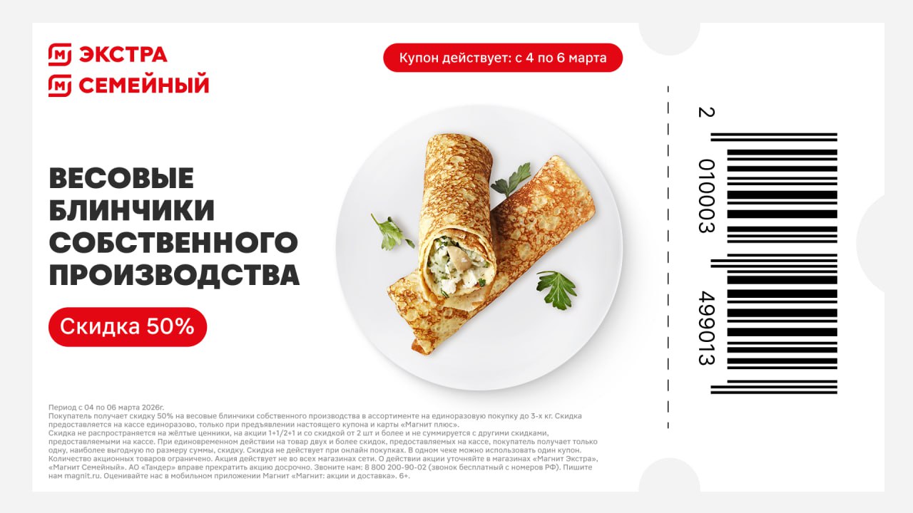 Подписана на группу Магнита и там опубликовали такой купон. С 4 по 6 марта скидка 50% на весовые блинчики собственного производства (до 3-х кг) в магазинах Магнит Семейный или Экстра. На кассе надо показать свою карту Магнит и купон.