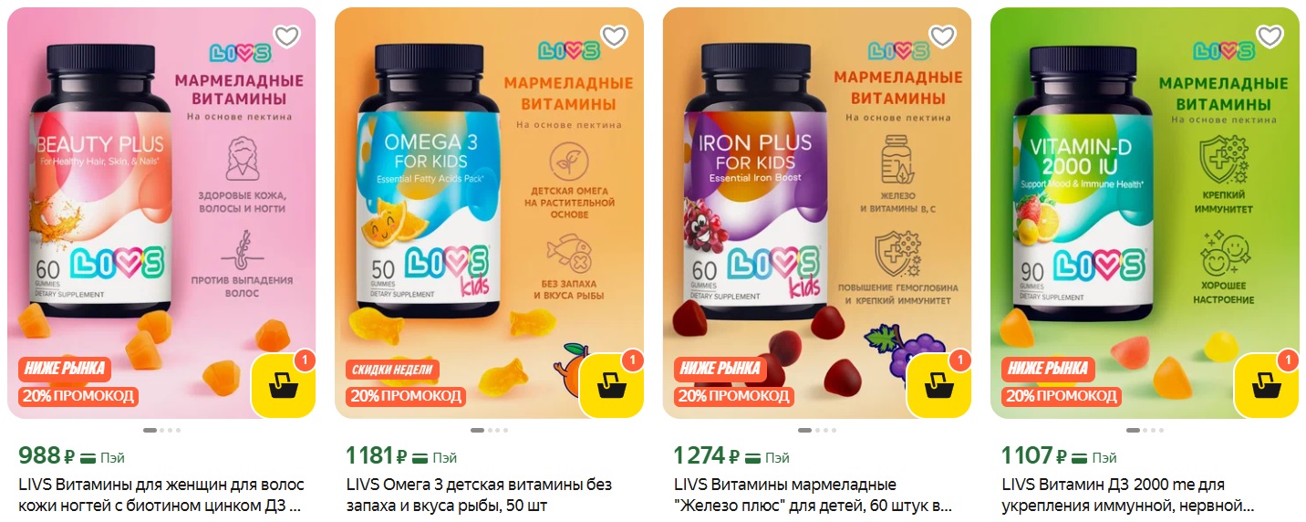 Витамины и биологически активные добавки для всей семьи в удобных и вкусных формах (пастилки, жевательные таблетки) с 20% скидкой за подписку на магазин. Цены получаются ниже чем в других магазинах.