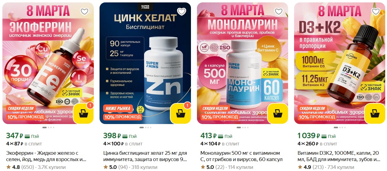 Качественные витамины, минералы и БАДы, есть в разных формах: капла, капсулы, таблетки. Цены на витамины и БАДы доступные, можно взять для восполнения дефицитов или для профилактики и поддержски организма.