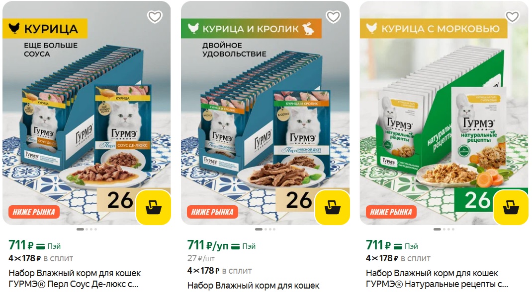 Наборы влажного корма для кошек Гурмэ 26 шт по 711 р, получается всего 27р за 1 пакетик, в розничных от 33р. В каталоге есть разные виды и вкусы, подходят для ежедневного кормления.