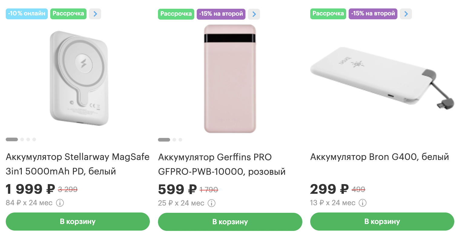 В ассортименте представлены различные бренды и модели разной ёмкости, в том числе с поддержкой MagSafe и беспроводной зарядкой. Однако в наличии в основном остатки товаров, и их доступность зависит от города. Проверяй, что есть у тебя.