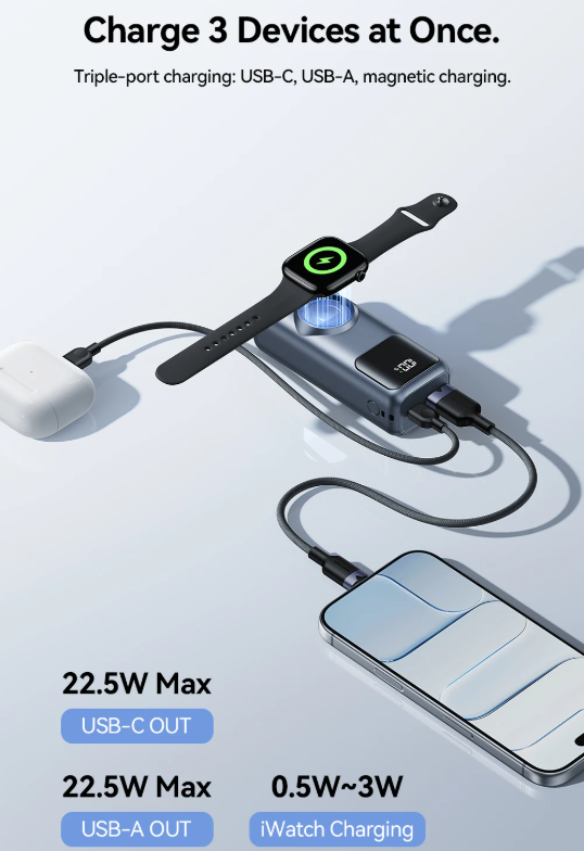 Магнитный компактный повербанк на 10000 мАч. Весит всего 169 г, легко помещается в карман. Есть встроенный кабель и беспроводная зарядка для Apple Watch (до 3 Вт). Быстрая зарядка 22.5 Вт через USB‑A и USB‑C - поддерживает QC, PD, PPS и другие протоколы. Можно заряжать три устройства одновременно.На корпусе цифровой дисплей, показывающий остаток заряда. Девять степеней защиты: от перегрева, перегрузки, короткого замыкания и т.д.