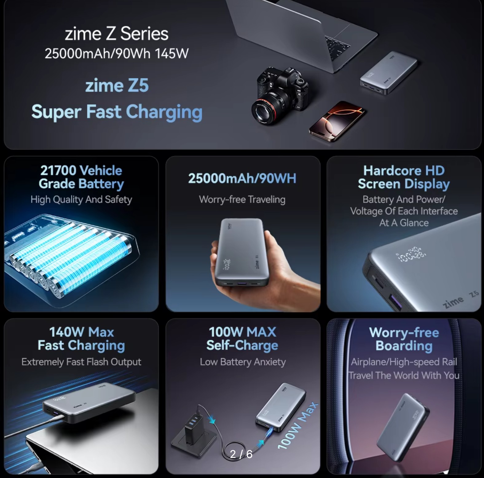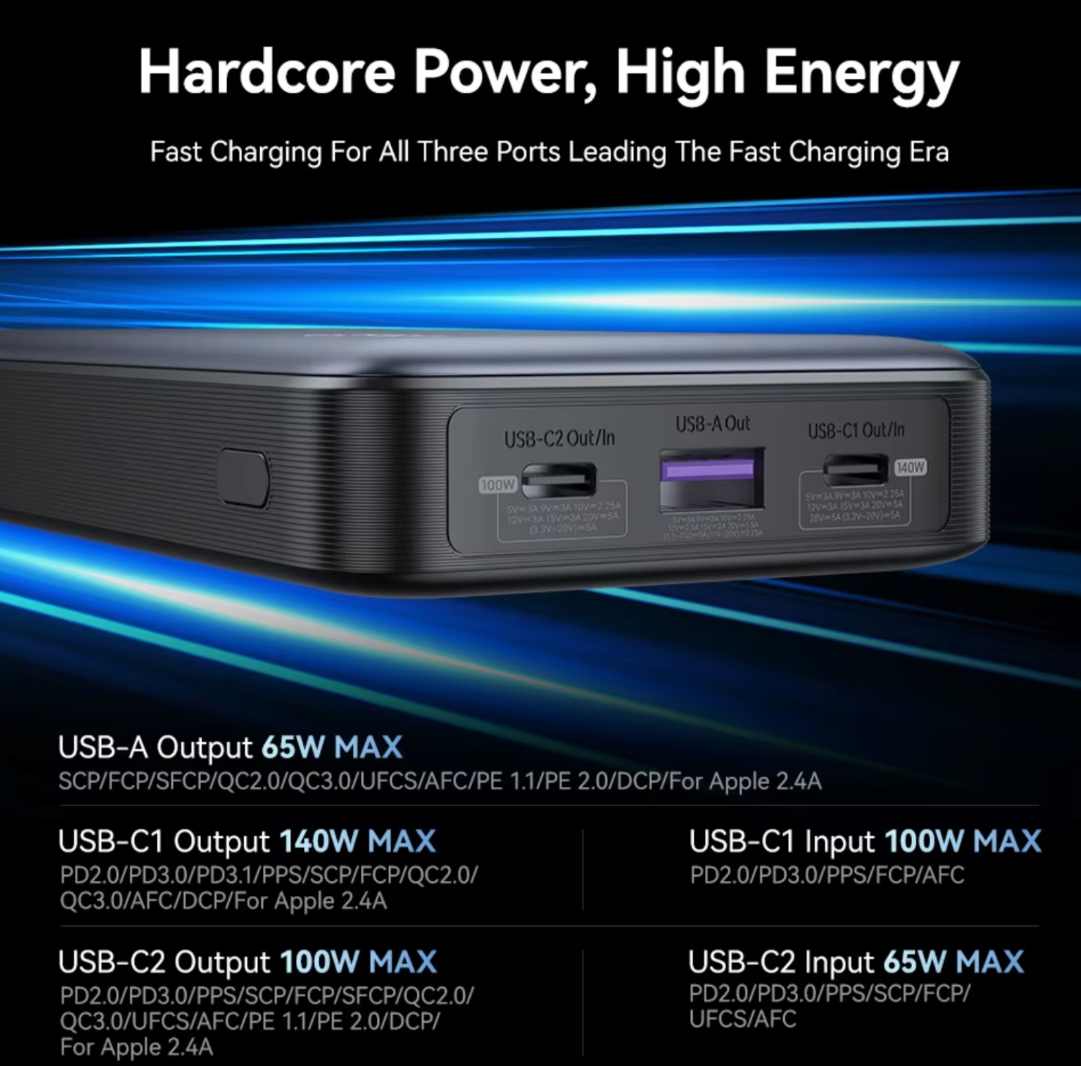 Можно брать в самолёт (сертификаты CE и CCC в порядке). Мощность на выходе до 140 Вт с порта USB-C1 (поддержка PD 3.2 / 28V / 5A), многопортовая раздача: 100 Вт + 45 Вт или 100 Вт + 15 Вт + 15 Вт.