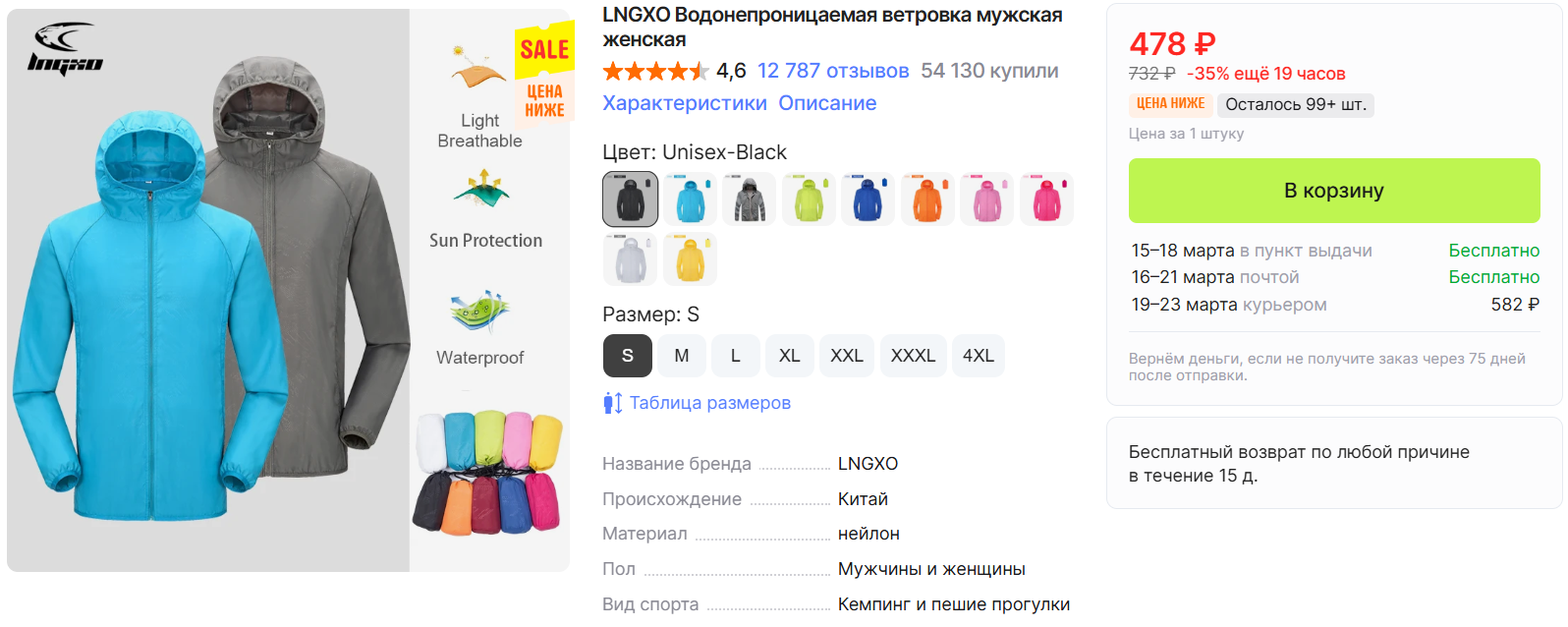 На AliExpress классные ветровки по низкой цене. Подойдут мужчинам и женщинам, есть капюшон, на выбор 10 цветов и 7 размеров.