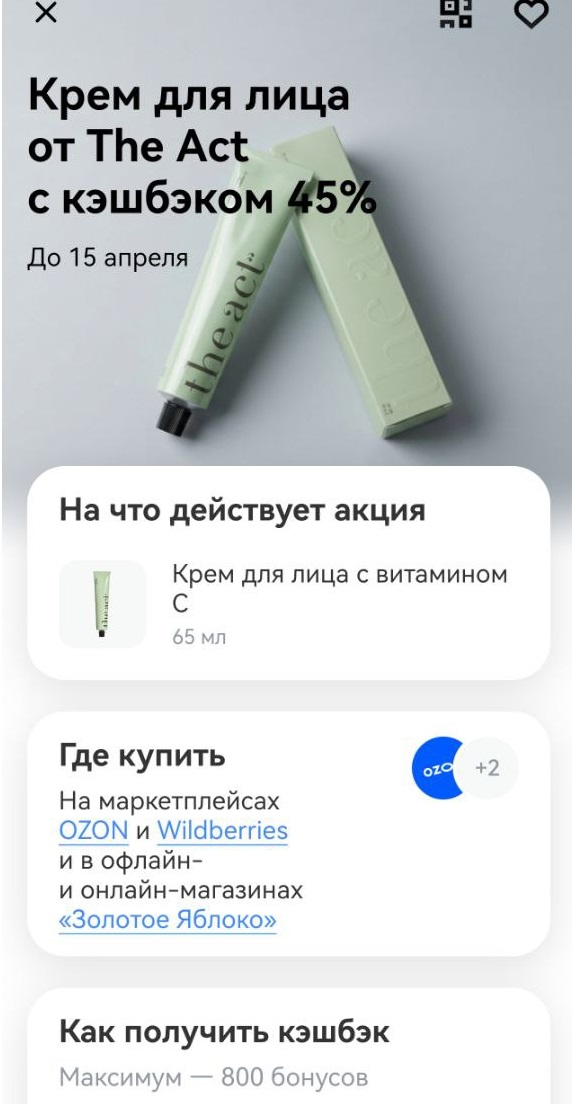 Сейчас крем для лица The Act vitamin C, 65 мл в яблоке за 615 рублей + у меня кешбэк 45% при оплате картой Т-Банка, думаю у всех, если не пользовались ранее предложением. Максимум там 800 рублей, то есть можно взять две