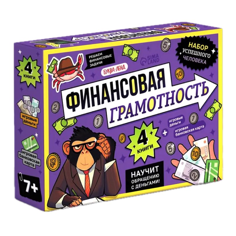 Например, можно взять набор "Финансовая грамотность", 4 книги за 532₽. Этот набор в игровой форме помогает детям от 7 лет освоить базовые финансовые навыки и сформировать ответственное отношение к деньгам через увлекательные истории и практические задания.