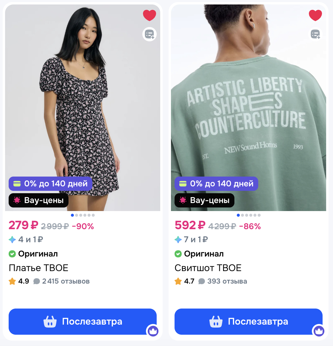 Цены в разы ниже, чем в магазинах. Например, свитшот мужской за 592р или платье женское за 279р!
